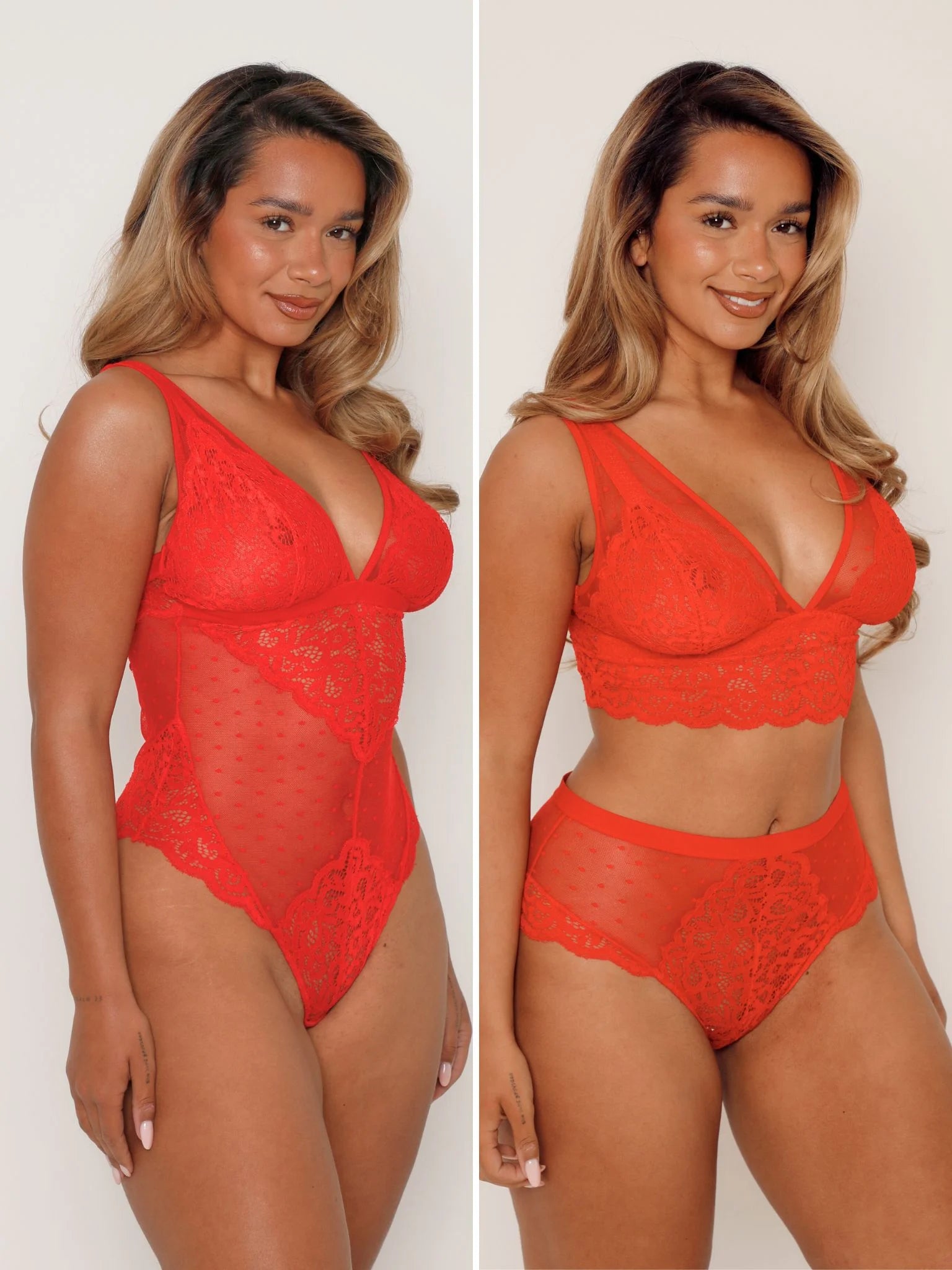 Woman wearing a red lace lingerie set against a plain background